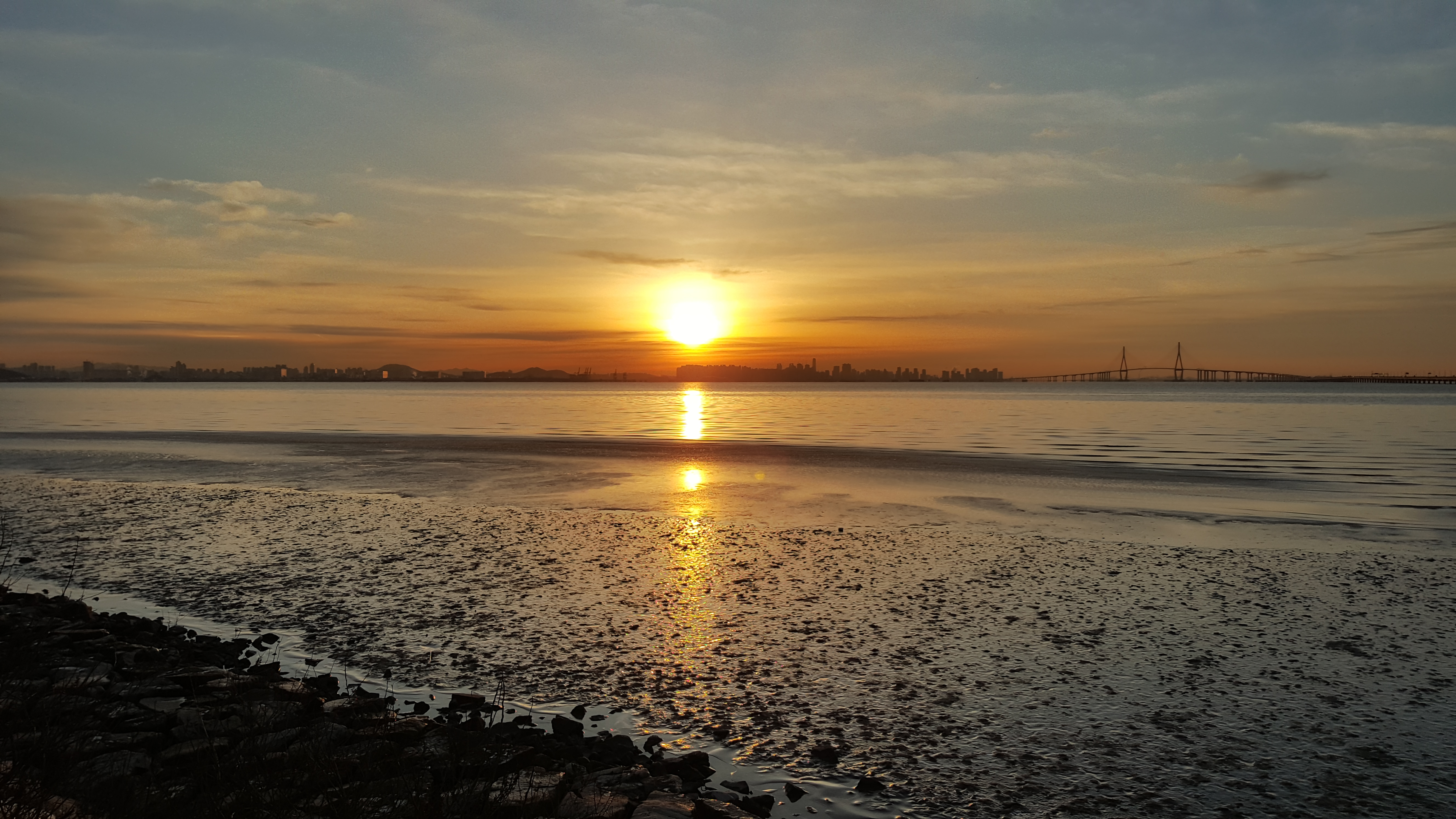인천대교 방향 오른 편, 구름과 안개에 엷어진 인천대교까지 담을 수 있어 해가 더 볼 만 하다.