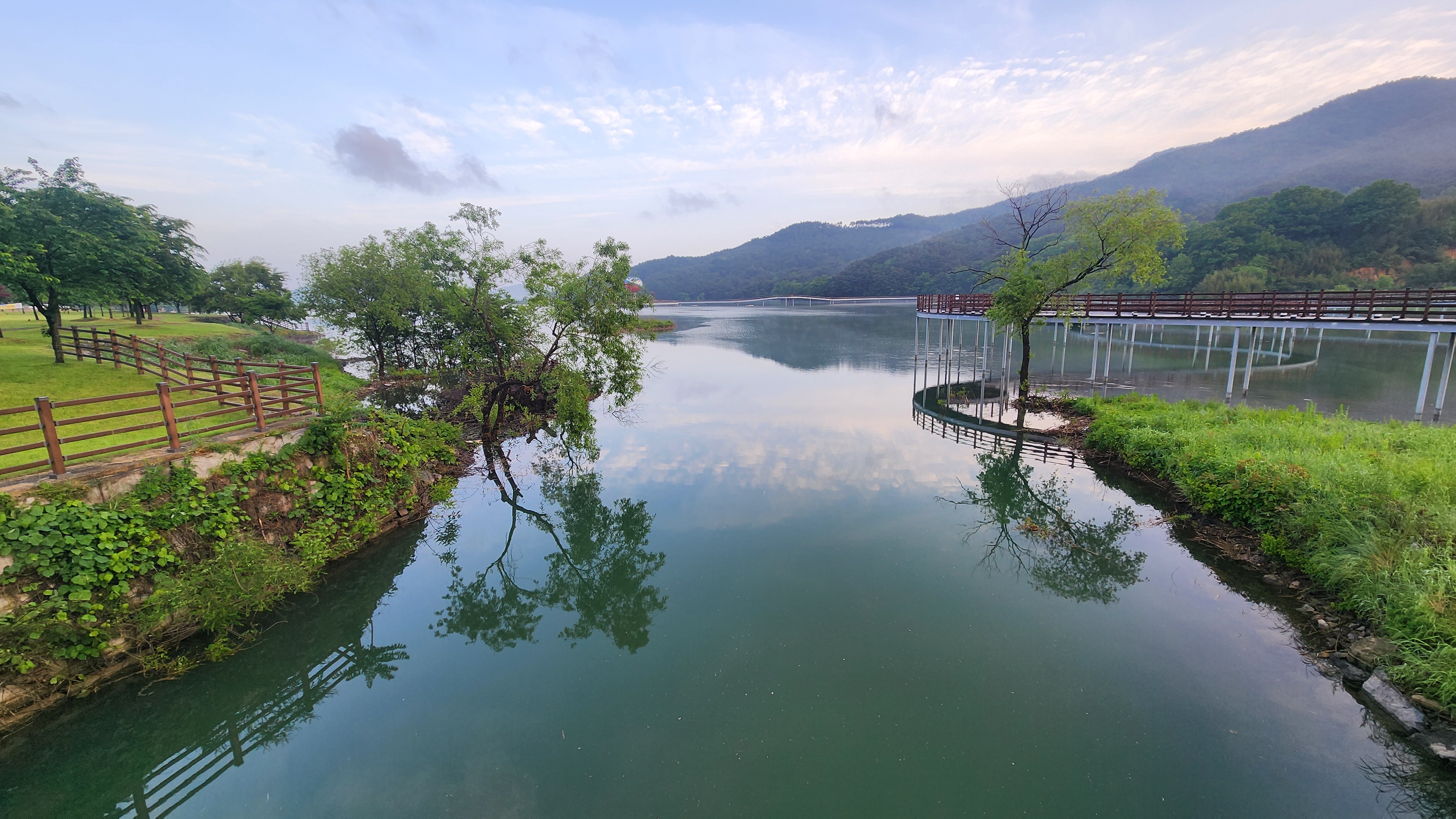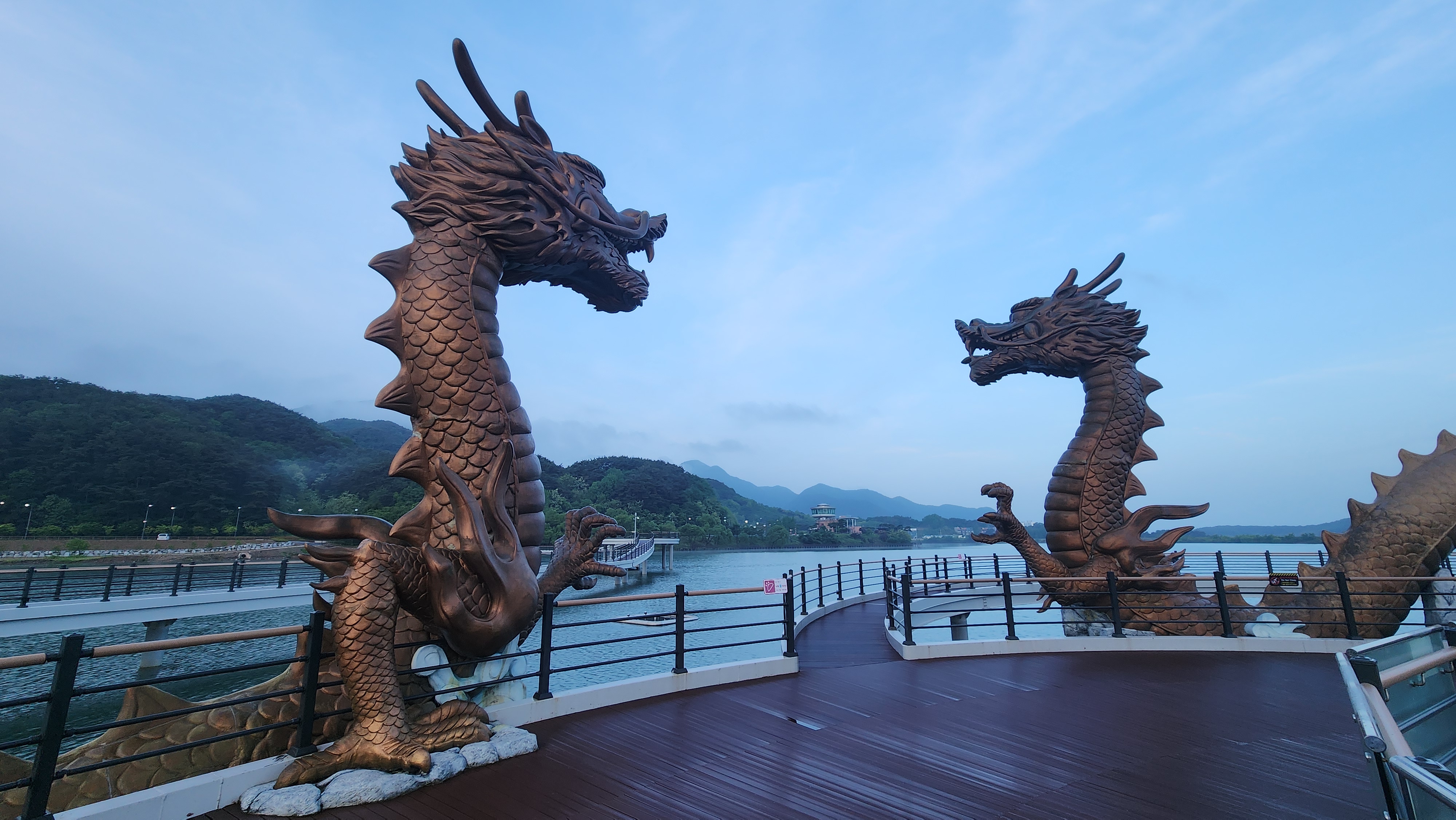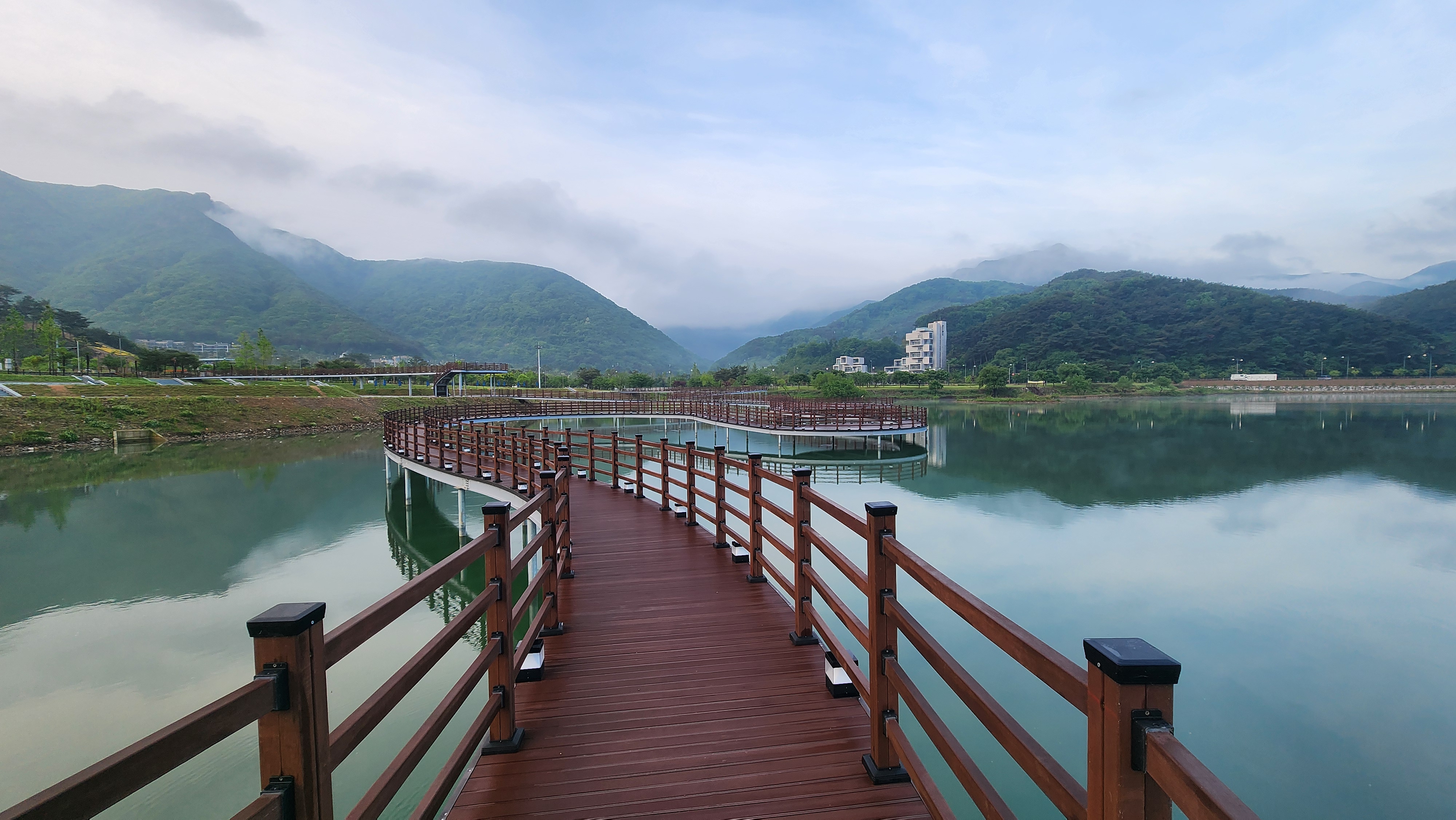 용산호 대략 가운데를 가로지르는 미르샘 다리를 건너 우로 한 바퀴, 좌로 한 바퀴 돌면 5Km가 된다.