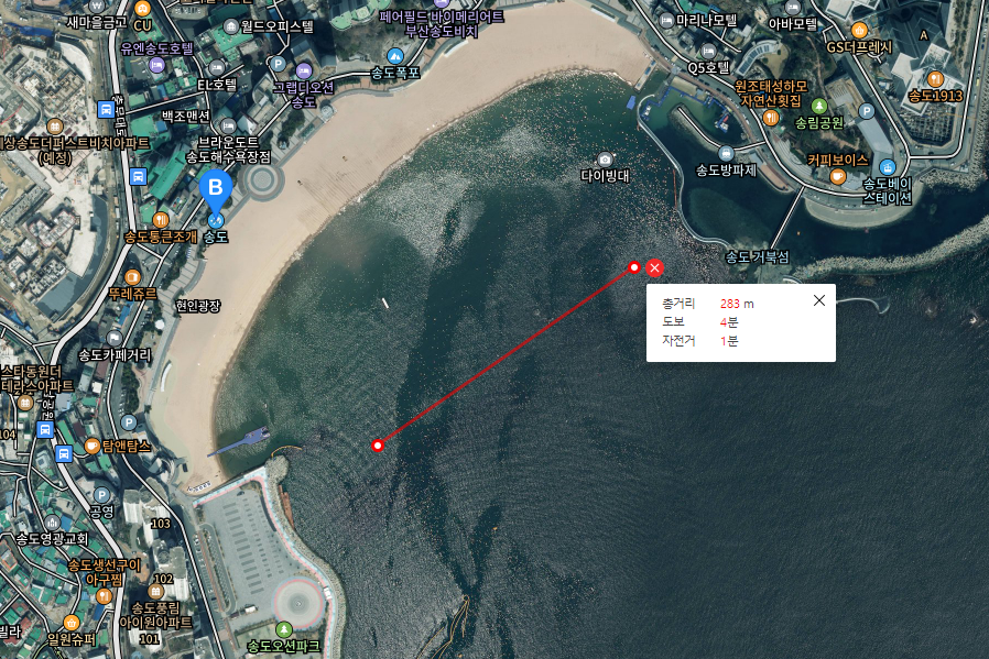 - 송도 스카이워크: 송도해수욕장에서 거북섬까지 이어지는 길이 약 365미터의 산책로입니다. 바다 위를 걷는 듯한 느낌을 주며, 스카이워크의 일부는 강화유리로 되어 있어 아래 바다를 내려다볼 수 있다.
