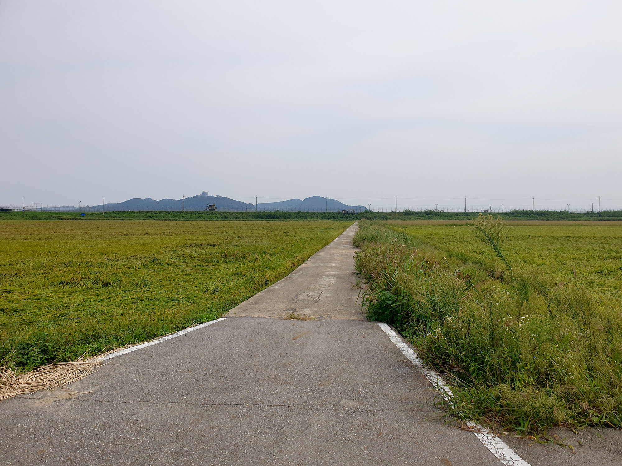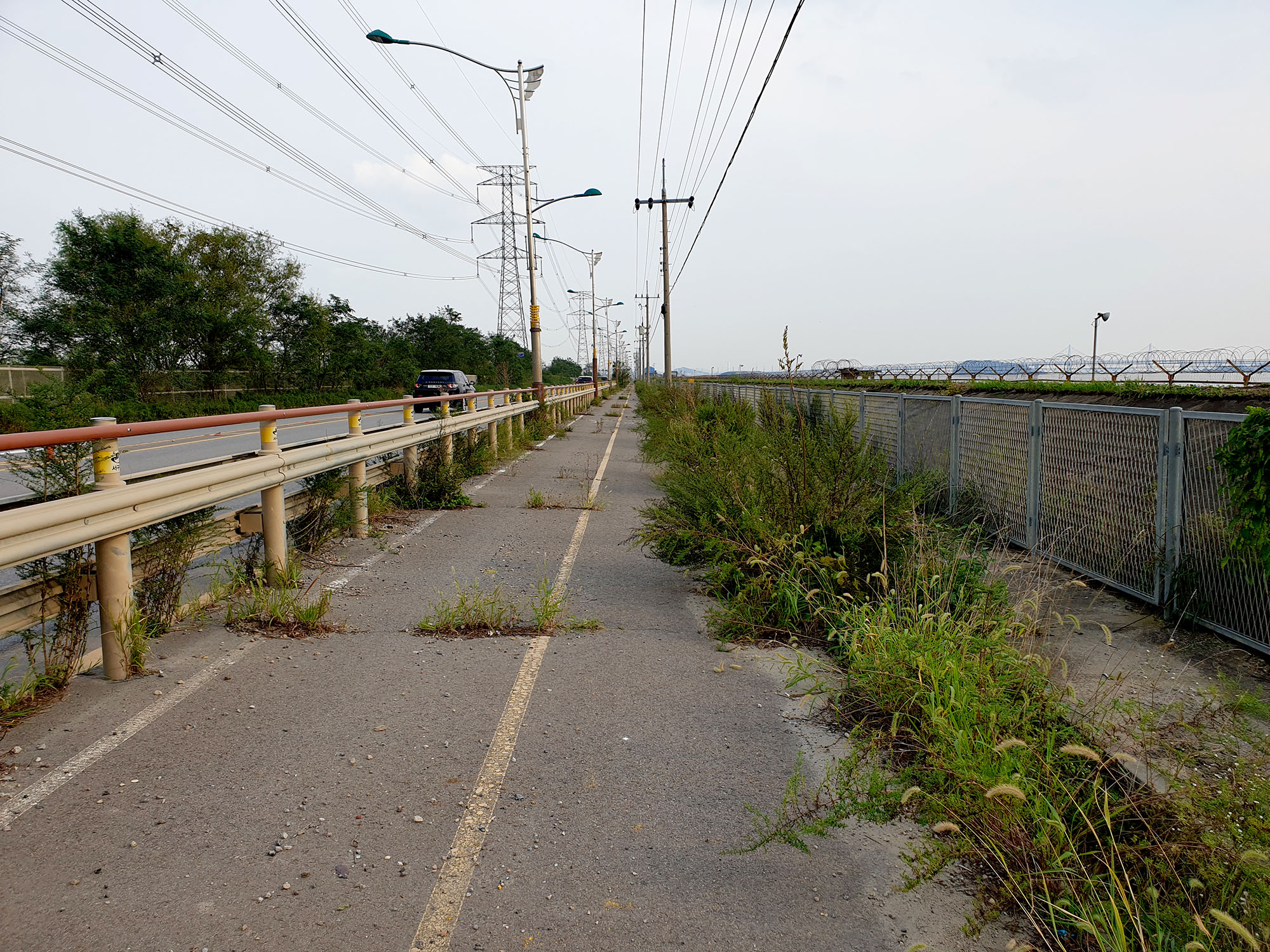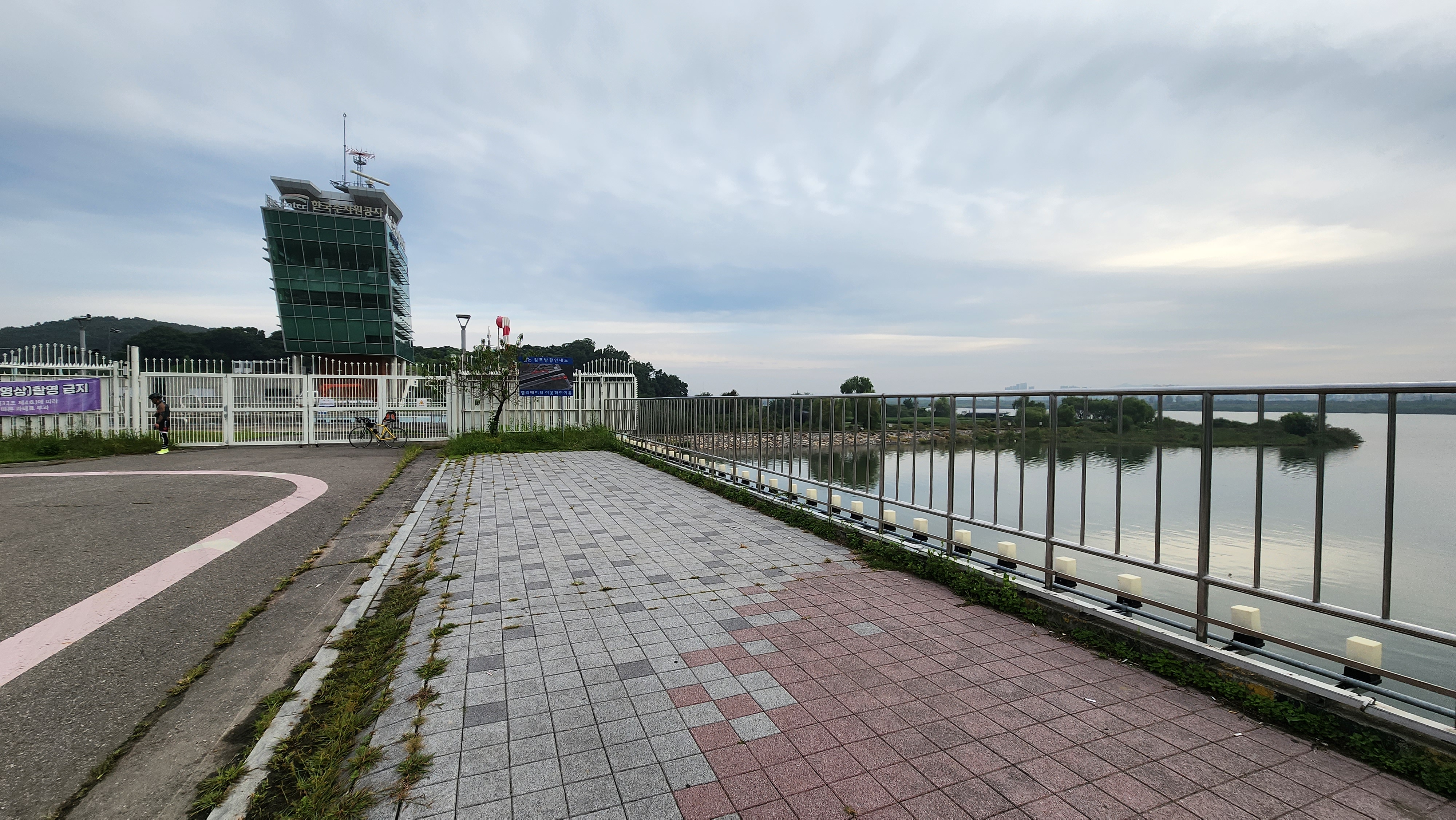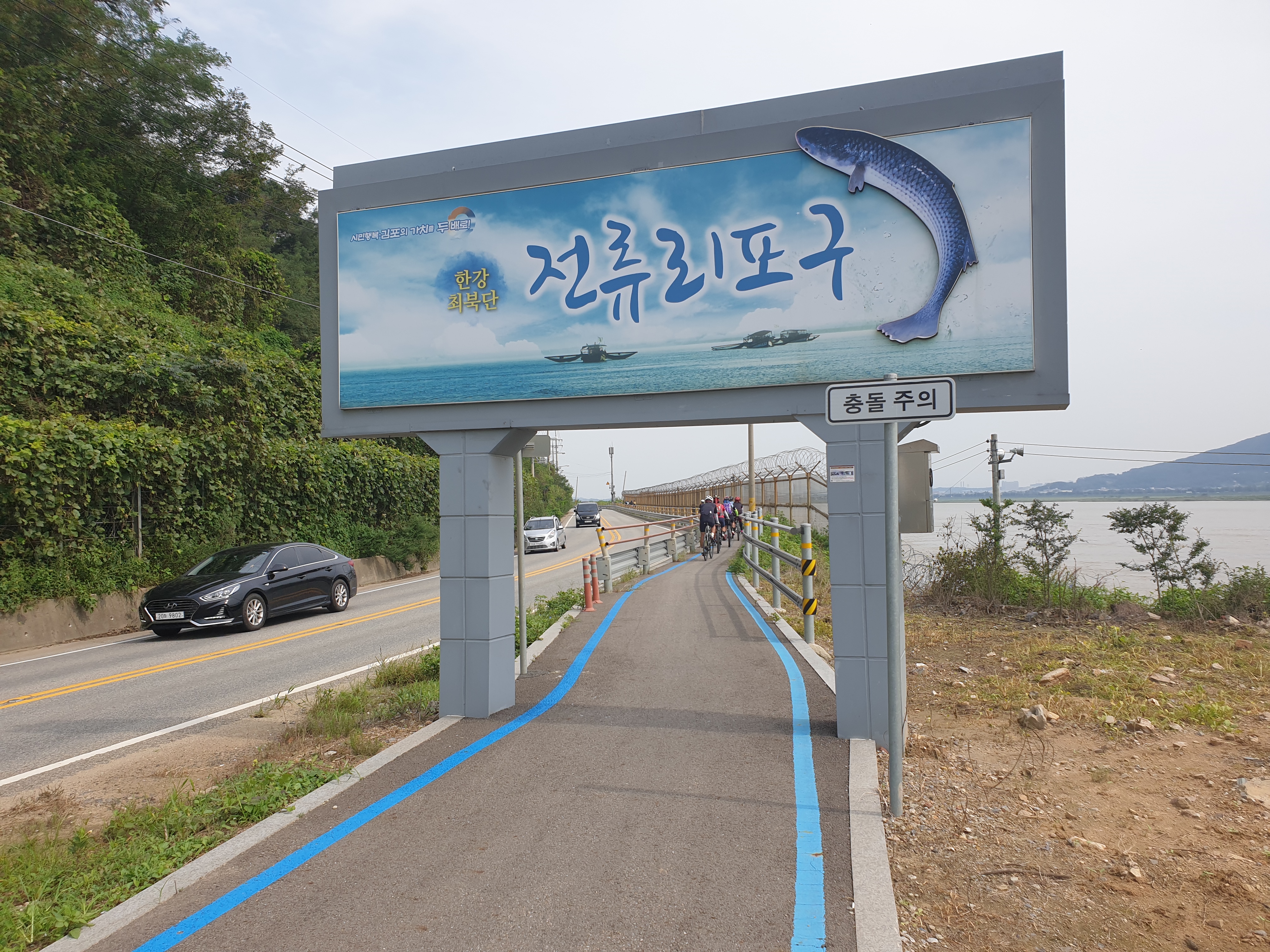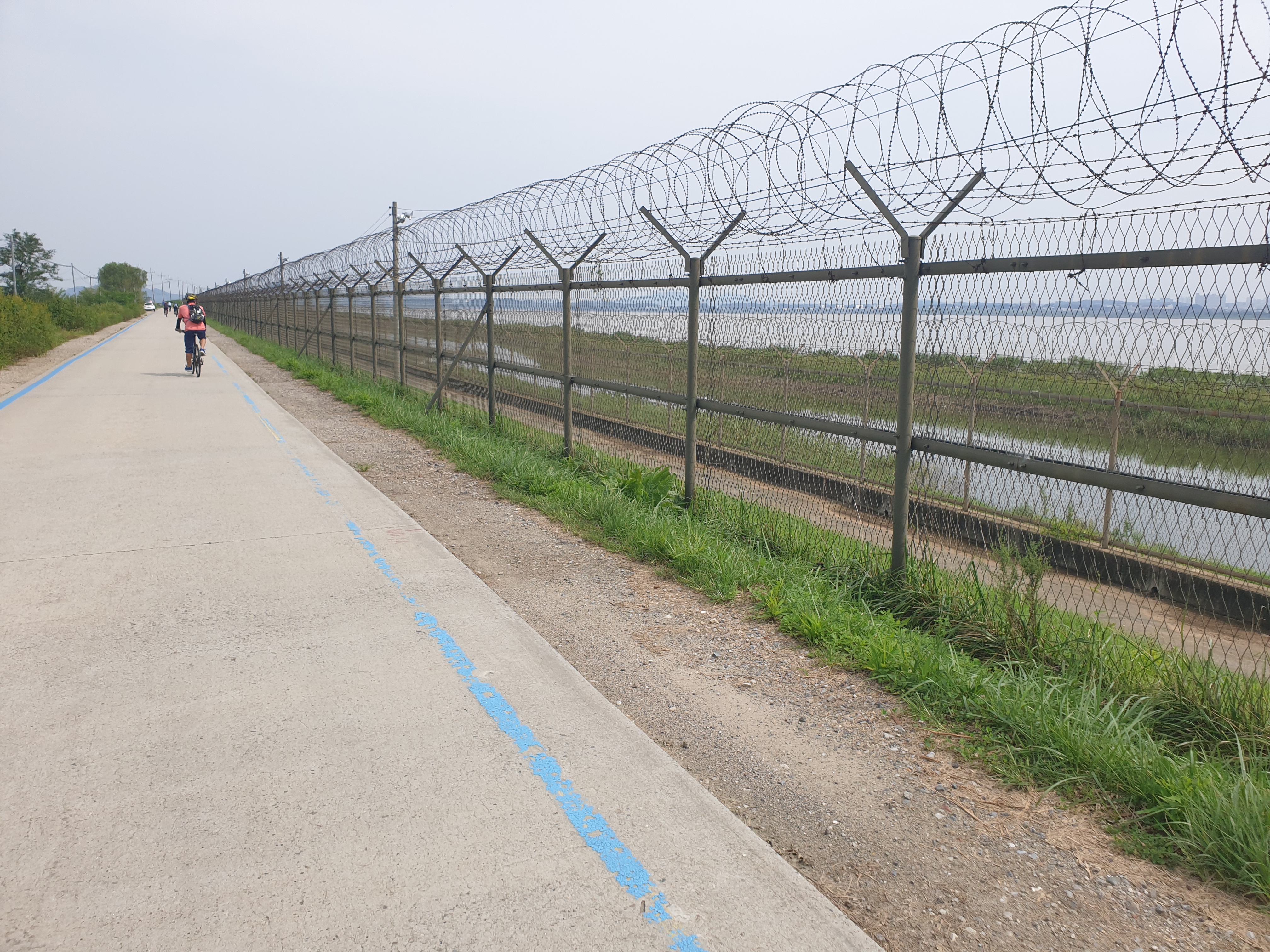 한강아라갑문에서 전호대교를 지나 전호야구장 방향으로 달리다보면 철책으로 둘러싸인 한강이 시작되는 평화누리길2코스가 시작된다.