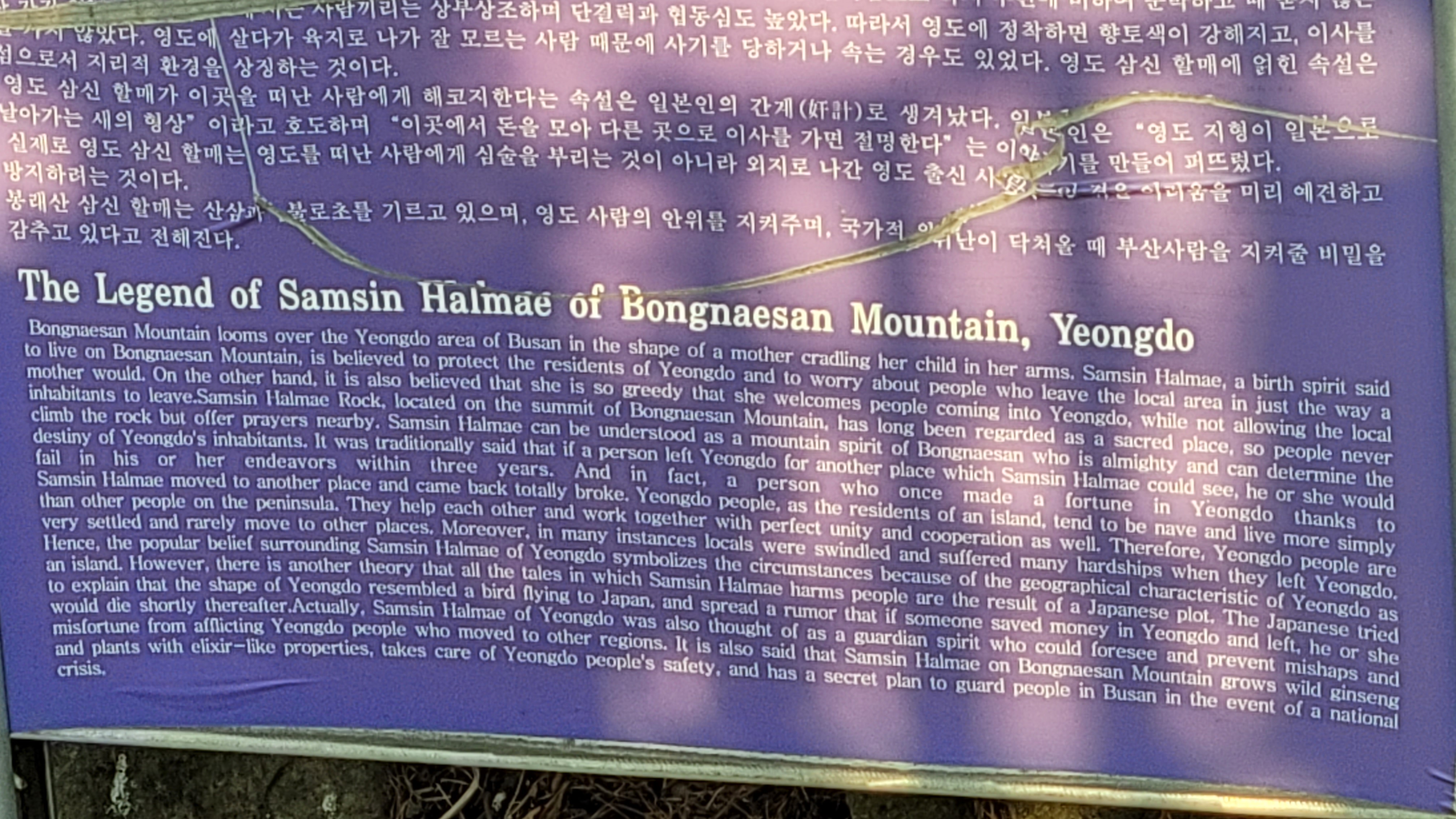 영도 삼신 할매가 이곳을 떠난 사람에게 해코지한다는 속설은 일본인의 간계로 생겨났다. 일본인은 "영도 지형이 일본으로 날아가는 새의 형상"이라고 호도하며 "이곳에서 돈을 모아 다른 곳으로 이사를 가면 절명한다"는 이야기를 만들어 퍼뜨렸다. 실제로 영도 삼신 할매는 영도를 떠난 사람에게 심술을 부리는 것이 아니라 외지로 나간 영도 출신 사람들이 겪은 어려움을 미리 예견하고 방지하려는 것이다.