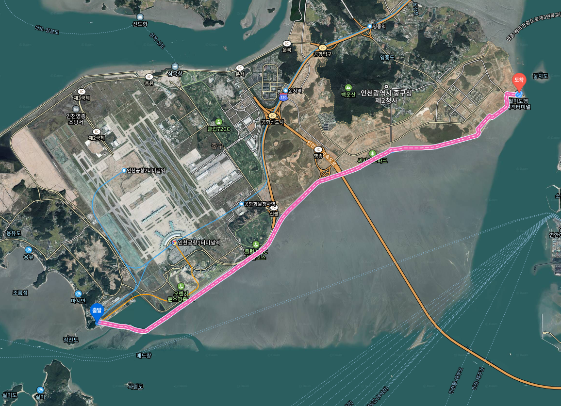 경유1 (천혜바다낚시) ~ 영종대교 구간 (3Km)은 아직 도로 공사 중 (2023.10.02 현재)